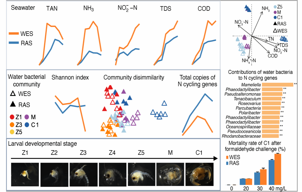 研究团队开发了一种拟穴青蟹循环水育苗系统,并探索了循环水系统对拟穴青蟹育苗的水体微生物群落和水质的管理效果及机制。结果发现,采用循环水养殖系统(RAS)获得的苗种活力高于换水系统(WES),但RAS育苗水体的总氨氮、NH3、NO2--N、总氮、总可溶性固体和化学需氧量均显著低于WES,而且RAS育苗水体与WES的差异细菌数随着幼体发育持续增多。这些水质指标与育苗后期水体细菌群落变化紧密相关。FAPROTAX和定量PCR分析均显示RAS水体细菌群落的氮循环功能潜力显著增强,随机森林分析表明RAS水体富集的细菌特别是橙黄褐指藻杆菌(Phaeodactylibacter)、黏着杆菌(Tenacibaculum)和氢嗜菌(Hydrogenophaga)可能通过同步硝化反硝化作用去除含氮污染物。此外,2.5 m3的RAS育苗规模就能比WES节水18.5 m3。该项研究表明循环水可作为拟穴青蟹苗种培育过程中水体微生物管理的有力手段,提出了利用RAS进行水体微生物管理的新论点,同时为高质量拟穴青蟹苗种规模化培育这一产业难题提供了全新的解决思路。