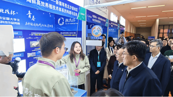 决赛期间,团中央书记处第一书记阿东参观指导了《沙漠养海鲜——新疆等西北沙漠地区海鲜高效养殖技术体系的构建与应用》项目。校党委副书记张真柱充分肯定了项目的应用价值和意义,鼓励同学们再接再厉。