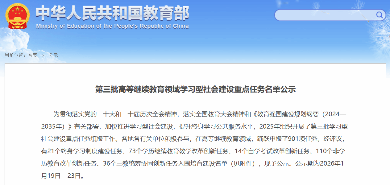 近日,教育部公布第三批高等继续教育领域学习型社会建设重点任务名单,色花堂