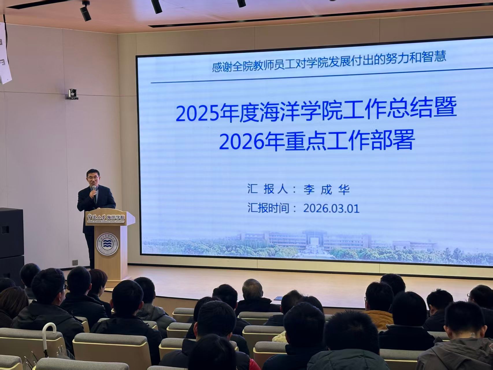 院训发布仪式暨全院教职工大会在梅山校区中试基地报告厅隆重举行。全体教职工、梅山校区管委会负责人、退休教师代表、校友代表、学生代表及院训征集活动获奖者齐聚一堂,见证院训启用,共启事业发展新征程。会议由学院党委副书记张乐主持。