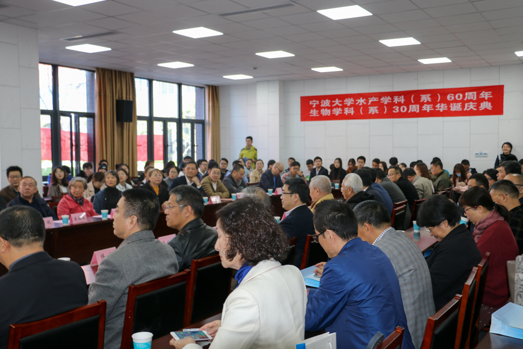 梅山校区竺银康楼107举行水产学科(系)60周年、生物学科(系)30周年华诞庆典,学科老教师代表、校友代表和师生代表共120余人参与庆典,色花堂